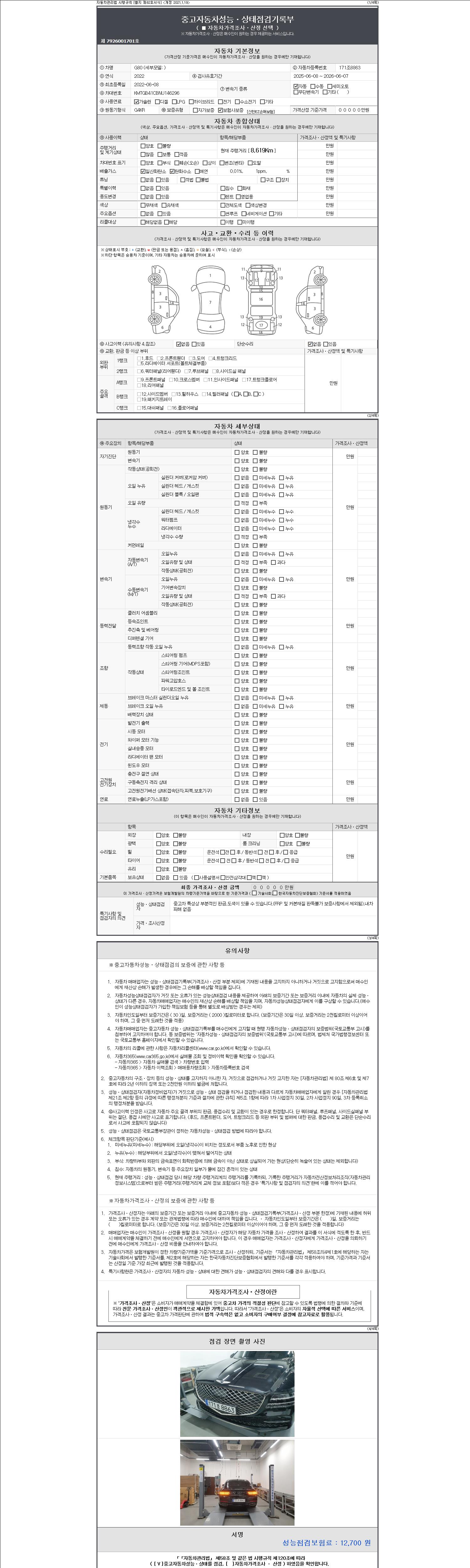 자동차관리법 시행규칙 제120조의 규정에 따라 별지 제 82호서식 《중고자동차 성능, 상태점검 기록부》를 발행한 성능, 상태점검자 및 매매자는 아래의 보증기간 또는 보증거리 이내의 중고자동차, 성능점검 기록부에 기재된 내용과 자동차의 실제 성능, 상태가 다른 경우 계약 또는 관계법령에 따라 매수인에 대하여 책임을 집니다.