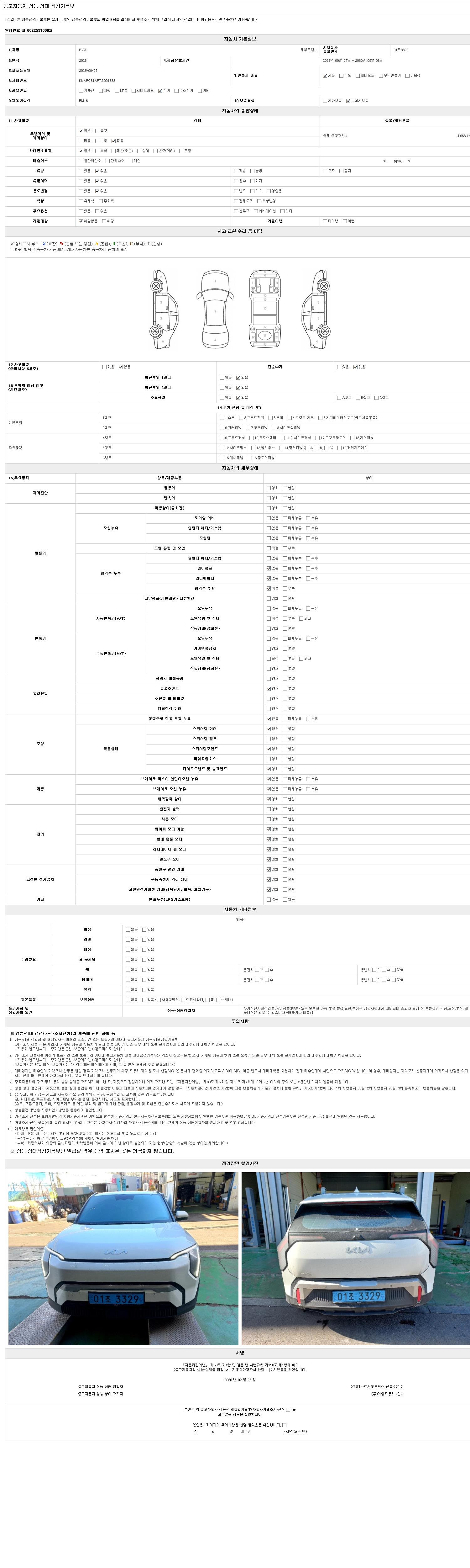 | 주행거리 | 4,962 km | 차량번호 | 01조3329 | 사고유무 | 성능기록부 참조 | 제시번호 | 제 2026005788 호 |