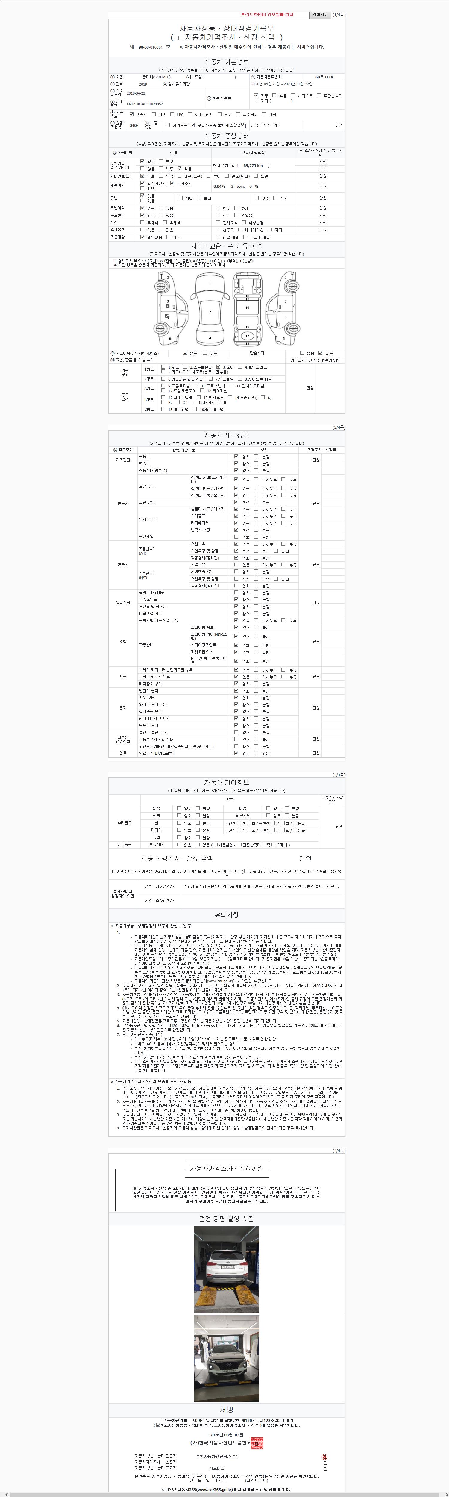 | 주행거리 | 85,285 km | 차량번호 | 60주3118 | 사고유무 | 성능기록부 참조 | 제시번호 | 제 2026039290 호 |
