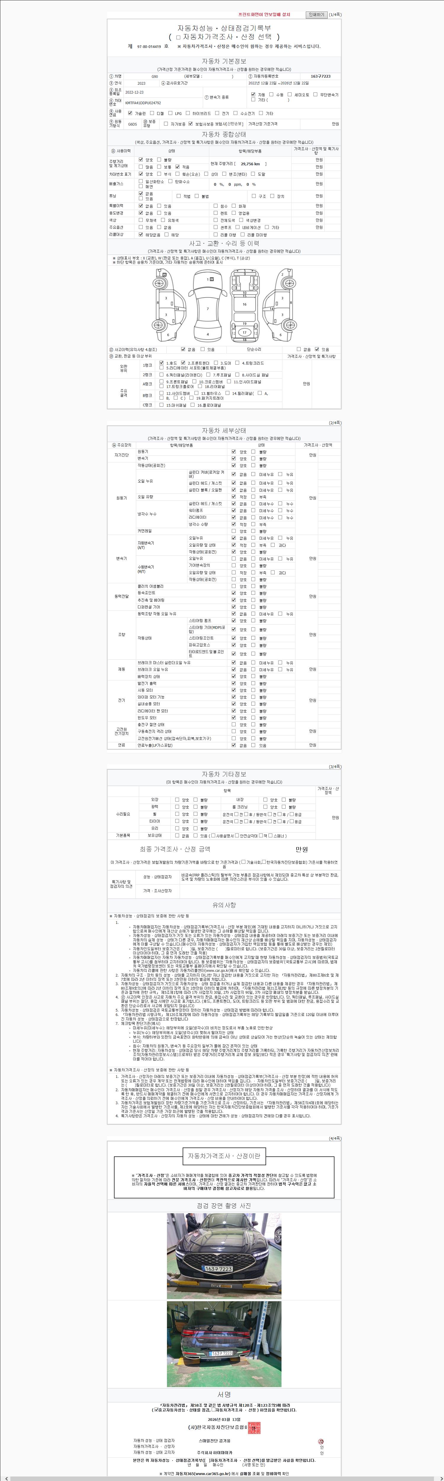 | 주행거리 | 29,768 km | 차량번호 | 163구7223 | 사고유무 | 성능기록부 참조 | 제시번호 | 제 2026032650 호 |