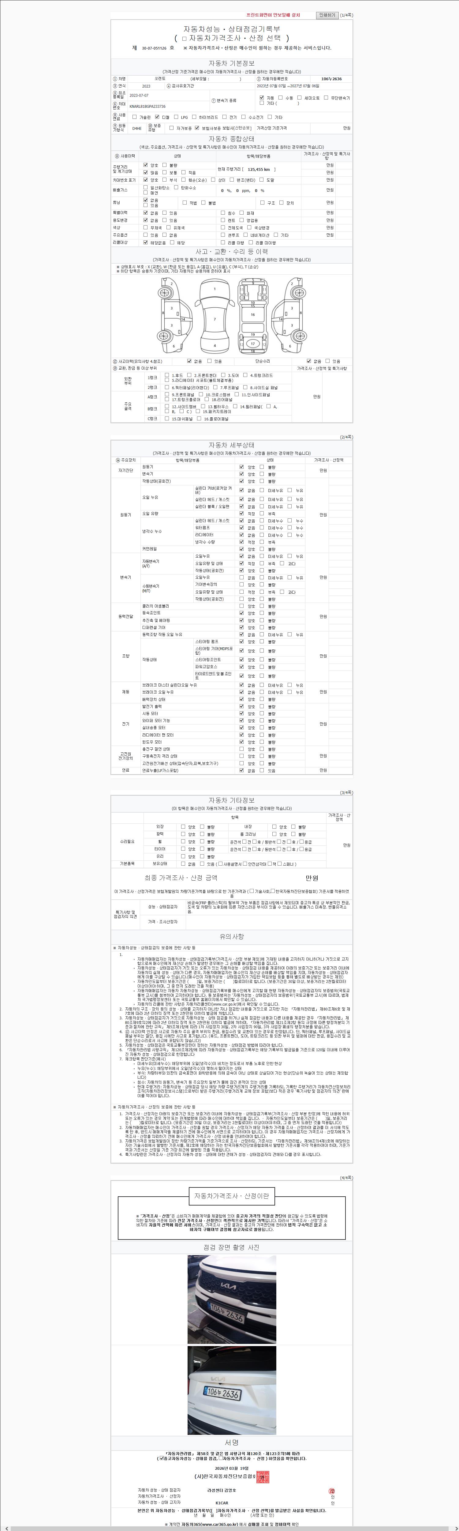 | 주행거리 | 125,454 km | 차량번호 | 106누2636 | 사고유무 | 성능기록부 참조 | 제시번호 | 제 2147483647 호 |