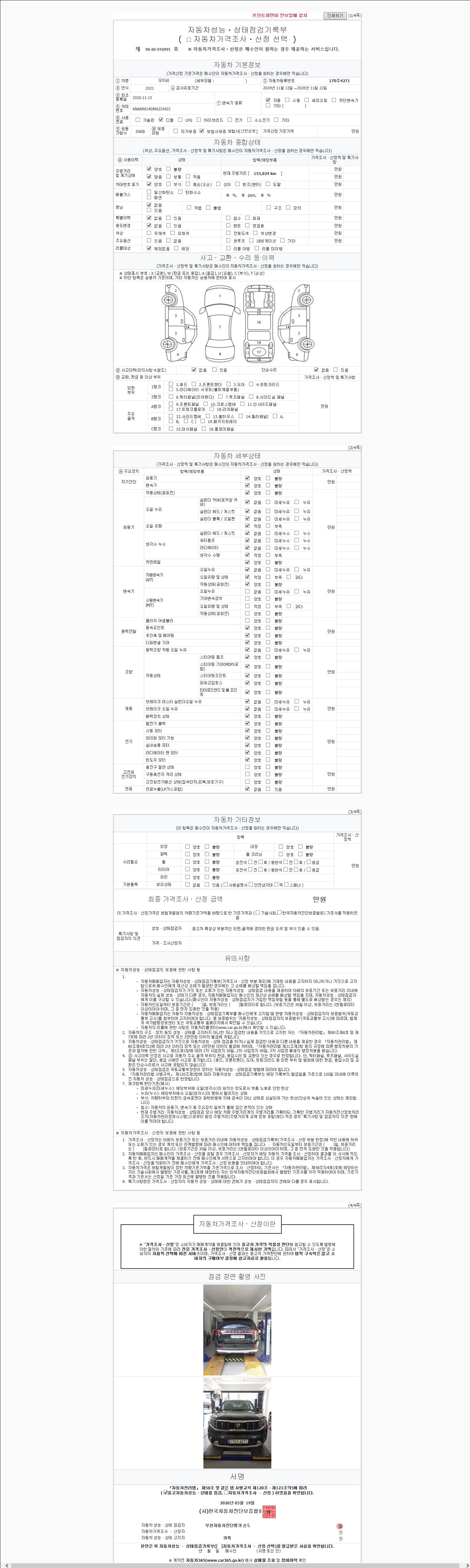 | 주행거리 | 155,821 km | 차량번호 | 170주4271 | 사고유무 | 성능기록부 참조 | 제시번호 | 제 2026014474 호 |