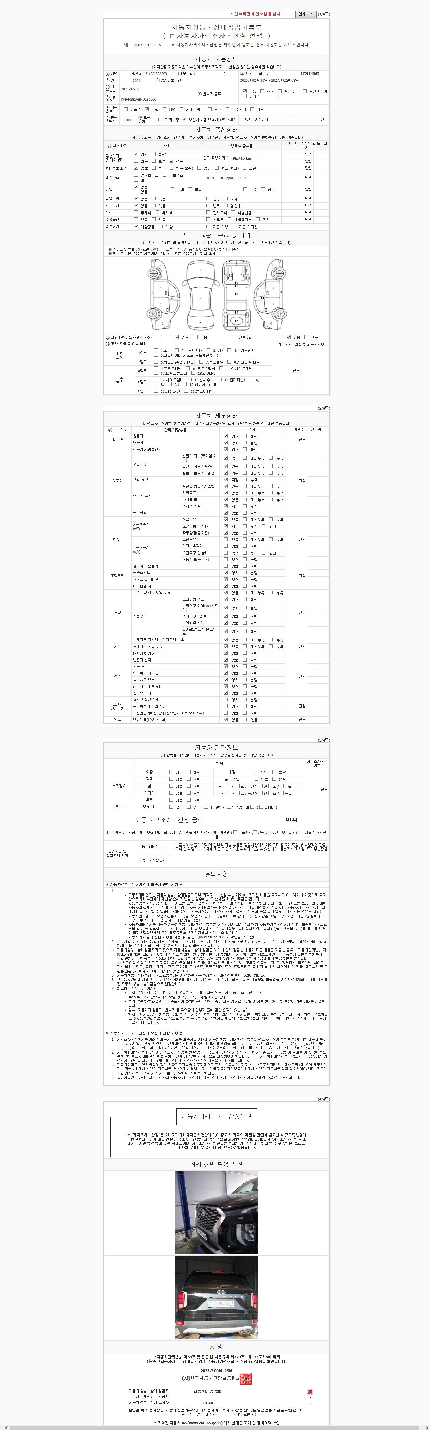 -중고자동차 매매업자를 통해 차량을 구입하실 경우 반드시 "중고자동차 성능, 상태점검 기록부"를 교뷰 받으셔야 하며, 매매업자는 반드시 의무 교부 하여야 압니다.