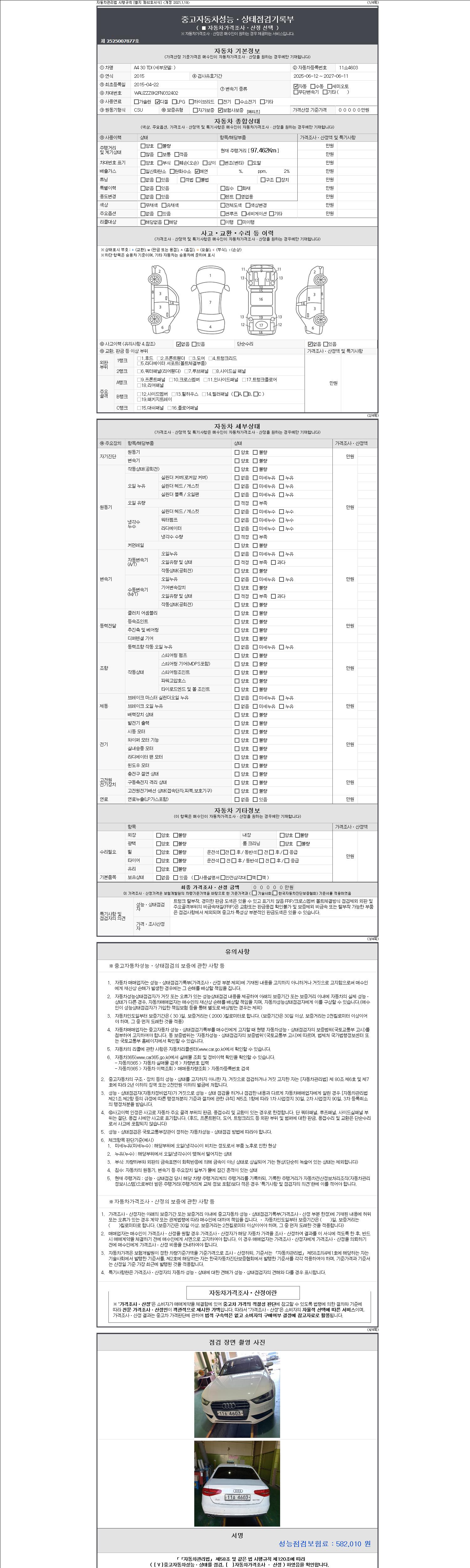 -중고자동차 매매업자를 통해 차량을 구입하실 경우 반드시 "중고자동차 성능, 상태점검 기록부"를 교뷰 받으셔야 하며, 매매업자는 반드시 의무 교부 하여야 압니다.