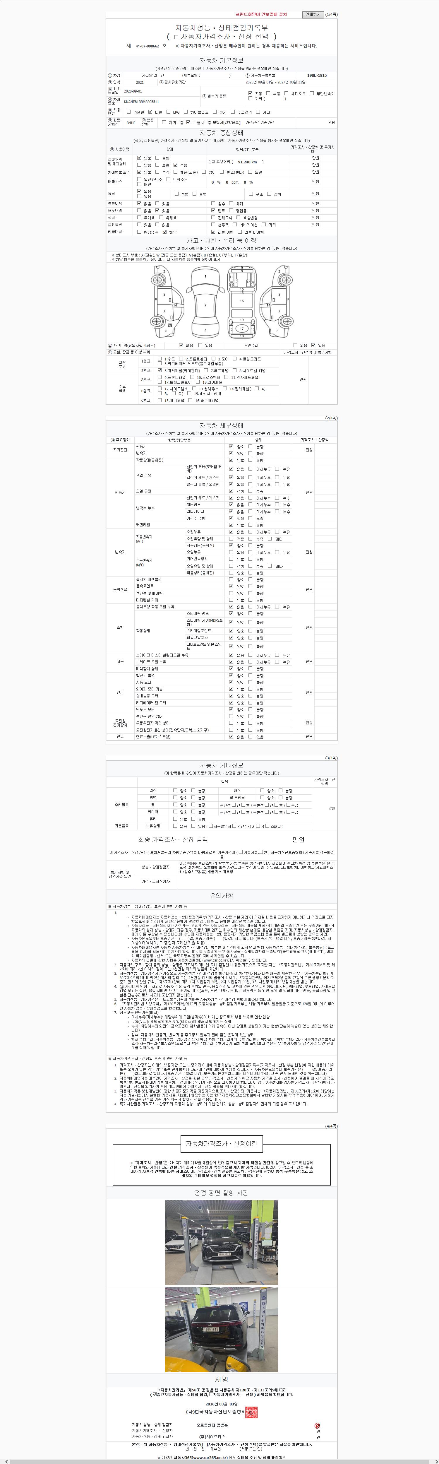 | 주행거리 | 91,240 km | 차량번호 | 190마1815 | 사고유무 | 성능기록부 참조 | 제시번호 | 제 2147483647 호 |