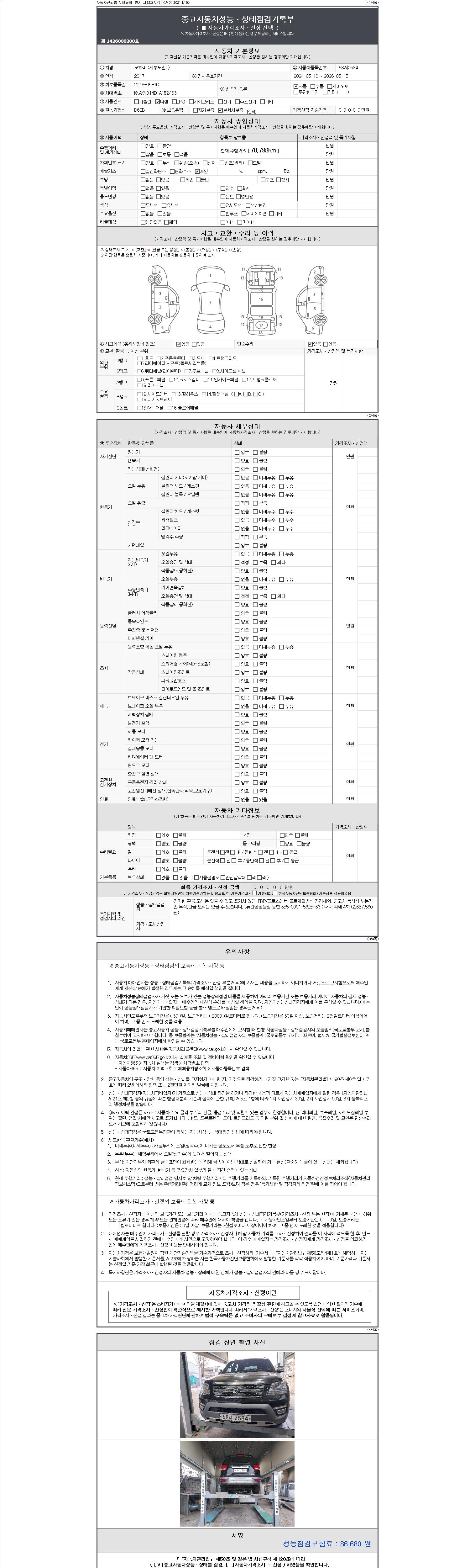 | 주행거리 | 78,798 km | 차량번호 | 68저2584 | 사고유무 | 성능기록부 참조 | 제시번호 | 제 2147483647 호 |