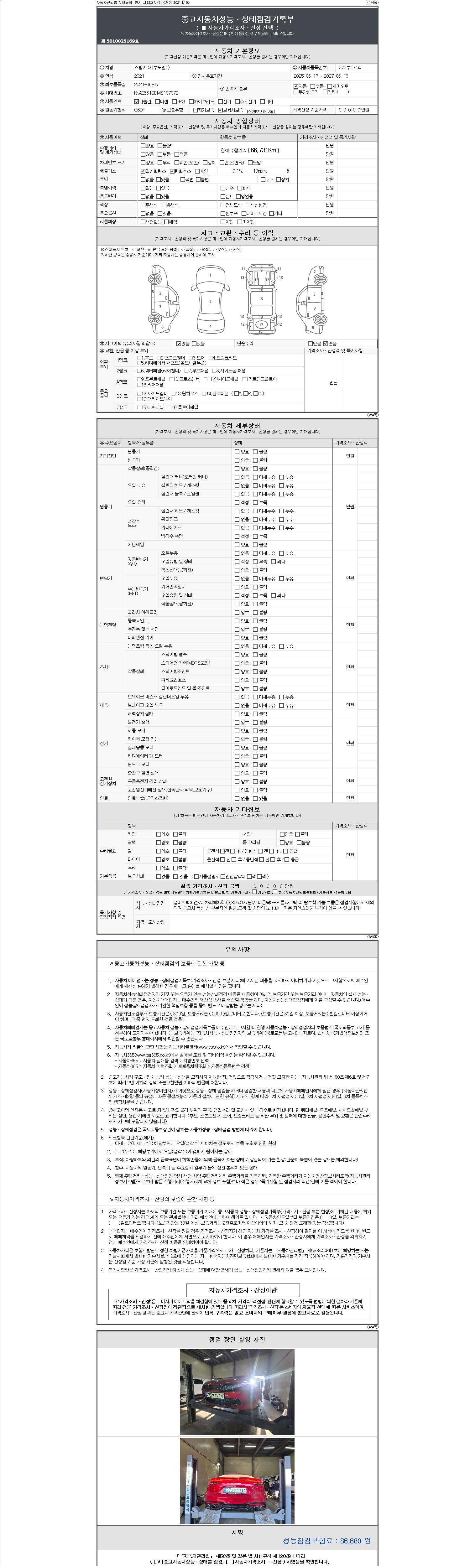 | 주행거리 | 66,731 km | 차량번호 | 273루1714 | 사고유무 | 성능기록부 참조 | 제시번호 | 제 2147483647 호 |