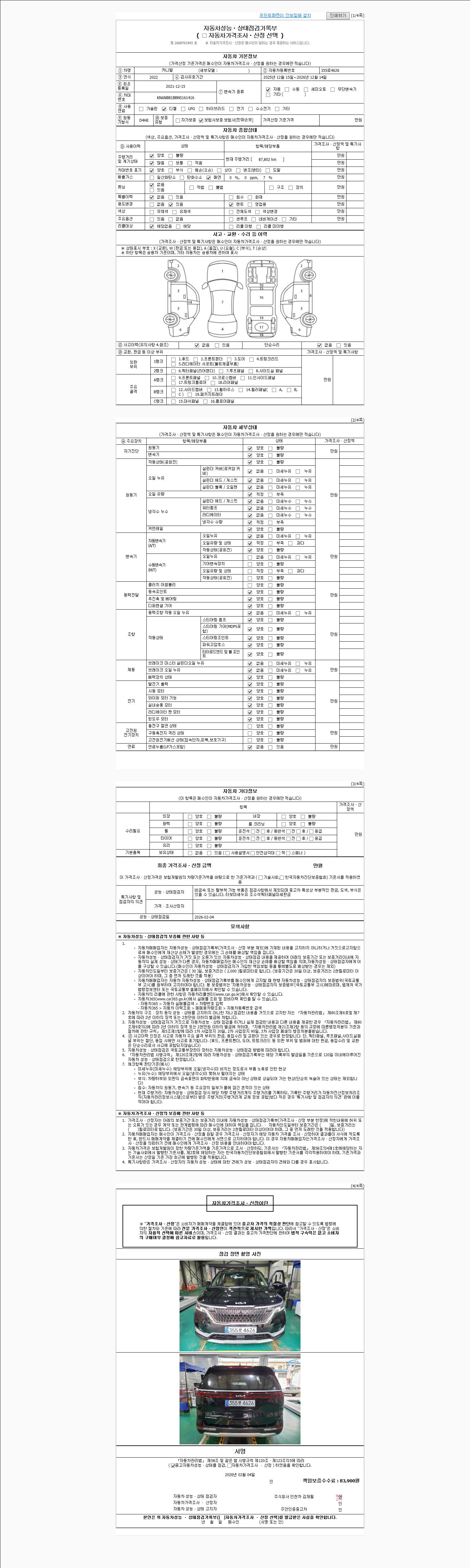 | 주행거리 | 87,751 km | 차량번호 | 355로4626 | 사고유무 | 성능기록부 참조 | 제시번호 | 제 2026005527 호 |