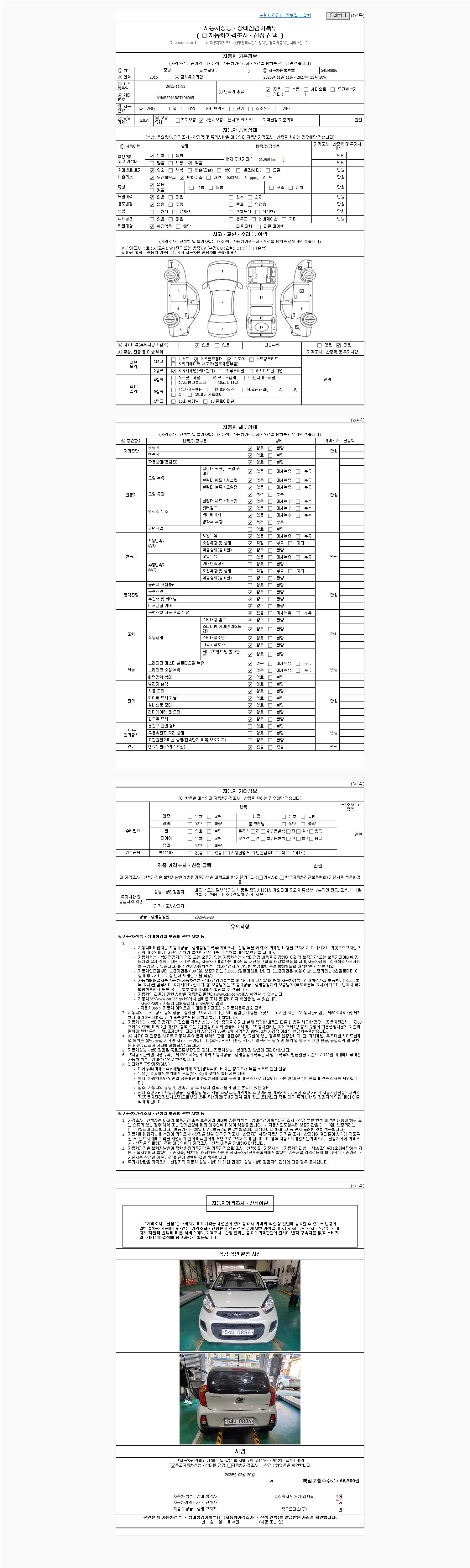 | 주행거리 | 61,969 km | 차량번호 | 54마0886 | 사고유무 | 성능기록부 참조 | 제시번호 | 제 2026008819 호 |
