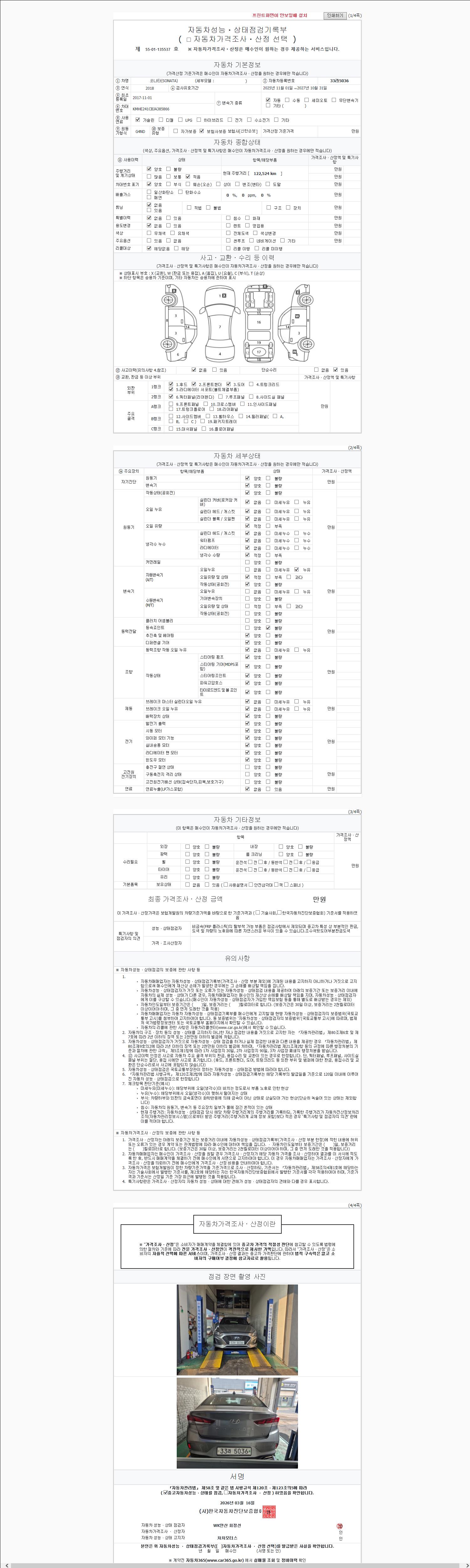 | 주행거리 | 122,524 km | 차량번호 | 33라5036 | 사고유무 | 성능기록부 참조 | 제시번호 | 제 2147483647 호 |